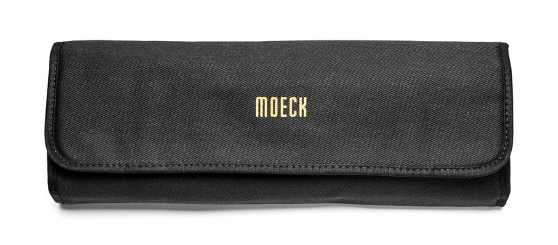 Schwarze Baumwolltasche für eine dreiteilige Altblockflöte, mit Fächern für Korkfett, Wischerstab und Pflegetuch.