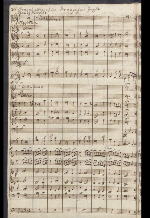 Abb. 2: Ouverture „Hamburger Ebb‘ und Flut“ C-Dur (TWV 55:C3), Partitur des Menuet (Quelle 1) mit Flauto Piccolo 1 und 2