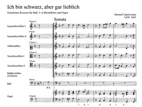 Capricornus, Samuel: Ich bin schwarz, aber gar lieblich (1664). Geistliches Konzert für Bass, 5–6 Blockflöten c2c2f1c1c1(f0), B. c.; in: Flauto e Voce II, Carus CV 11.210