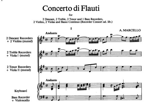 Marcello, Alessandro: Concerto di Flauti für Blockflöten c2 f1 c1 f0 (mehrfach besetzt, mit Duplierung durch Streicher), B. c.; Nova Music 135