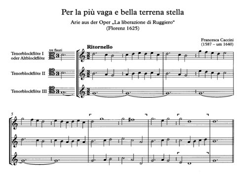 Caccini, Francesca: Pel la più vaga e bella terrenta stella; Arie aus der Oper La liberazione di Ruggiero (1625) für Tenor, 3 Blockflöten c1 c1 c1, B. c.; in: Flauto e Voce 14, Edition Walhall EW1053