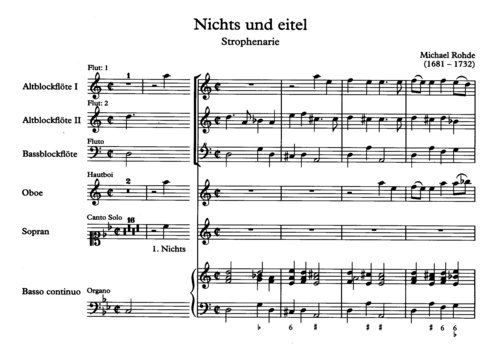 Rohde, Michael: Nichts und eitel; Arie für Sopran, 3 Blockflöten f1 f1 f0, Oboe, B. c.; in: Flauto e Voce 16, Edition Walhall EW1109