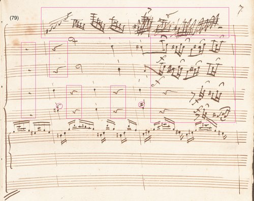 Hier ist die Lage genau umgekehrt: Wq 169 wurde eindeutig von C. Ph. E. Bach selbst für Flöte eingerichtet nach dem Orgelkonzert Wq 34. Zum Glück ist die Handschrift, in welche der Komponist seine Bearbeitung eingetragen hat, überliefert, so dass man den Arbeitsvorgang genau verfolgen kann. C. Ph. E. Bach ließ zuerst die Orgelfassung kopieren nach seinem Autograph, das aber schon erhebliche Ergänzungen und Überarbeitungen (unbekannten Datums) zeigte. Der Kopist ließ eine Zeile leer, worauf C. Ph. E. Bach selbst die Flötenstimme notierte, wenn sie nicht mit der rechten Hand der Orgel identisch war. Weil die Orgel irgendwie auch ein Blasinstrument ist, liegt eine Bearbeitung für Flöte nahe. Die Orgel hat aber einen unendlichen Atem und der Flötist nicht. Um dem Flötisten das Atemholen zu erleichtern – es bleibt immer noch schwierig genug – wurden einige lange Sechszehntelpassagen gekürzt und andere unterbrochen. Diese „Löcher“ wurden dann von den Streicherstimmen aufgefüllt (siehe Abb. 1). Die Eingriffe waren so erheblich, dass sowohl die Flöten- als auch die Begleitstimmen neu abgeschrieben werden mussten. Dieser Stimmensatz hielt sich offenbar ganz nahe an das Teilautograph, blieb in der Hausbibliothek und wurde 1792 für J. J. H. Westphal kopiert.