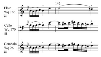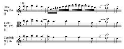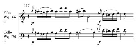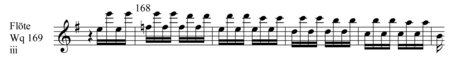 - Obwohl die wunderschönen langsamen Sätze oft recht gut auf der Flöte zu spielen sind, fällt auf, wie Wq 168/ii in der Violoncellofassung wegen der sehr hohen Lage strahlend klingt, während die Flöte extrem tief bleibt. Sie wird hier merkwürdigerweise nie oberhalb a2 geführt. Dies ist wohl dadurch verursacht, dass C. Ph. E. Bach in Wq 166–169 konsequent e3 als oberen Grenzton verwendete45.