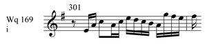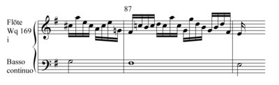 - Es gibt auch mehrere extrem lange Sechszehntelpassagen ohne geschickte Atemstellen, länger als in anderen Flötenwerken C. Ph. E. Bachs, z. B. in Wq 166/iii/101–11247.