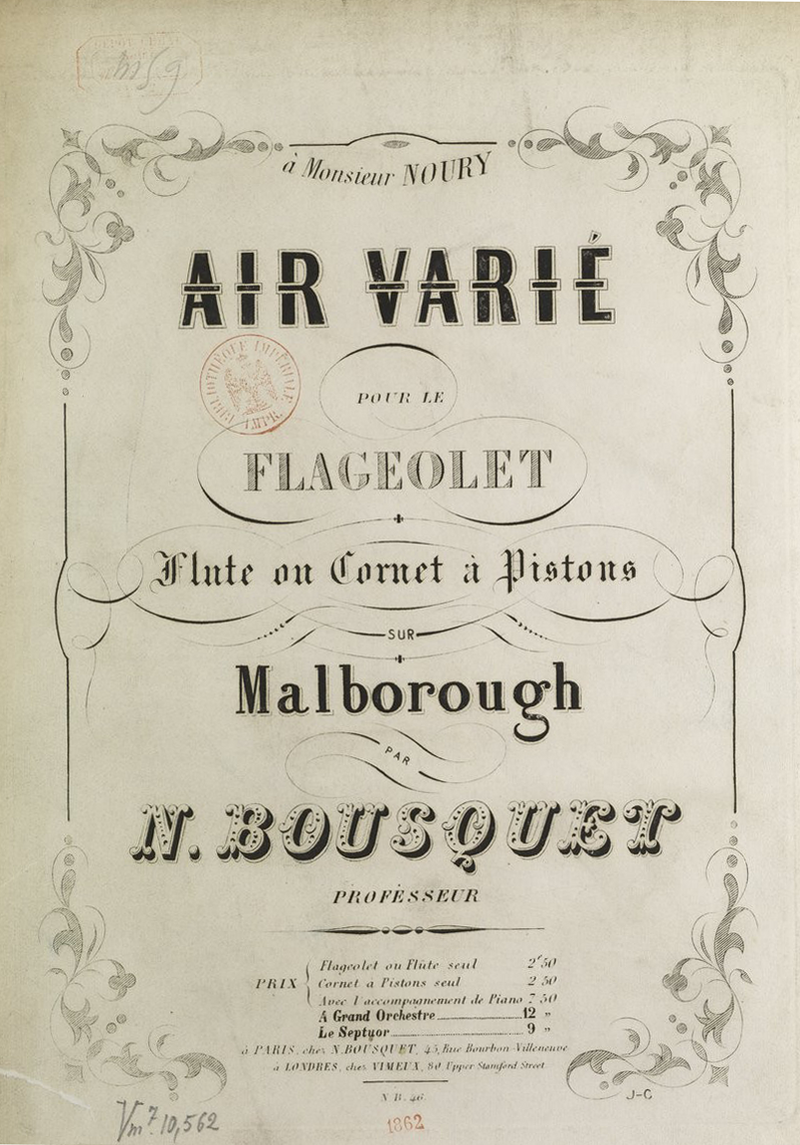 Bousquet, Narcisse (18..–1869). Compositeur. Air varié pour le flageolet, flûte ou cornet à pistons sur Malborough, par M. Bousquet. 1862. (gallica.bnf.fr / BnF)