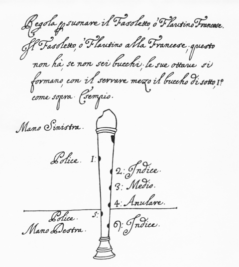 Selbstverständlich ist für die Ausführung der Flautino-Stimmen von einer Oktavierung auszugehen. Ohne die Arie Farfalletta ch’amante deliro ist der klingende Umfang der Flautino-Partien von Vater und Sohn Scarlatti also g2–e4. Für die Klärung der Frage, welches Instrument sich bei den beiden Scarlattis unter „Flautino“ verbirgt, sind die gleichen italienischen Quellen hilfreich, die auch bei Vivaldis Flautino heranzuziehen sind14, nämlich der Compendio musicale von Bartolomeo Bismantova, Ferrara 1677,15 und der Gabinetto armonico von Filippo B(u)onanni, Rom 1722 und 1776.16 Bismantova nennt neben dem Flauto Italiano (Blockflöte in g1) noch Il Flasoletto, ò Flautino alla Francese. Nach Abbildung und Beschreibung handelt es sich dabei um ein Französisches Flageolett mit vier vorderständigen Grifflöchern und zwei Daumenlöchern.
