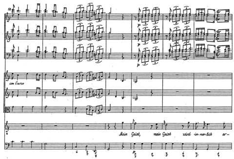 In der Choralkantate Ach Gott und Herr wie groß und schwer42 ist die Flaute piccolo in drei Strophen besetzt: In Strophe 7 dupliert sie den Cantus firmus, der vom Sopran vorgetragen wird, in Zweifußlage, in Strophe 8 spielt sie Überleitungen zwischen den vom Tenor gesungen Choralzeilen. Anlass für den Einsatz der Piccoloflöte war sicher der Text der 7. Strophe:43