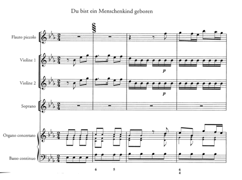 Vor kurzem ist Stölzels Kantate Uns ist ein Kind erschienen als Erstdruck vorgelegt worden.26 Es handelt sich dabei um die erste der beiden Kantaten27 zum 1. Weihnachtstag, die zu Stölzels Kantatenjahrgang 1729/30 gehören.28 Diese und auch die zweite Kantate Sehet, welch eine Liebe hat uns der Vater erzeiget29 ist für Soli, vierstimmigen Chor, 3 Trompeten, Pauken, Flauto piccolo, Streicher, obligate Orgel und Basso continuo bestimmt. In den beiden Kantaten ist jeweils eine Arie mit Flauto piccolo besetzt. In der ersten ist dies die Sopran-Arie Du bist ein Menschenkind geboren in Es-Dur, in der zweiten die Alt-Arie Ich bin Gottes Liebe Kind in c-Moll. In beiden sind neben dem Flauto piccolo noch zwei Violinen, obligate Orgel und Basso continuo vorgesehen. Der Part des Flauto piccolo ist in F-Dur bzw. d-Moll im französischen Violinschlüssel notiert. Das bedeutet, dass die Stimme in Griffnotation analog zur Blockflöte in f2 geschrieben ist,30 deren Stimmton jedoch eine große Sekunde tiefer lag als der Kammerton der Streicher. Der notierte Umfang des Flauto piccolo beträgt insgesamt a1 bis d3.