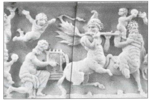 Noch eine Darstellung einer Querflöte in byzantinischer Tradition, die aus der zweiten Hälfte des 10. Jahrhunderts stammt, findet sich auf der Veroli-Schatulle, die sich in Veroli bei Rom befand und jetzt im Londoner Victoria and Albert Museum aufbewahrt wird.8 Nach der exquisiten Dekoration zu urteilen, steht sie in Verbindung mit einem Haushalt des höheren Adels in Konstantinopel und wurde wahrscheinlich für ein Mitglied des Hauses der Umayyaden angefertigt. Sie zeigt mehrere mythologische Szenen, darunter den Raub der Europa durch Zeus in Gestalt eines Stiers. Musik und Tanz sind mit Zentauren und Mänaden verbunden: zwei Zentauren (halb Mensch, halb Pferd) spielen Querflöte und Panflöte, neben einem Lyraspieler und mehreren Figuren mit Schlaginstrumenten (Abb. 6).
