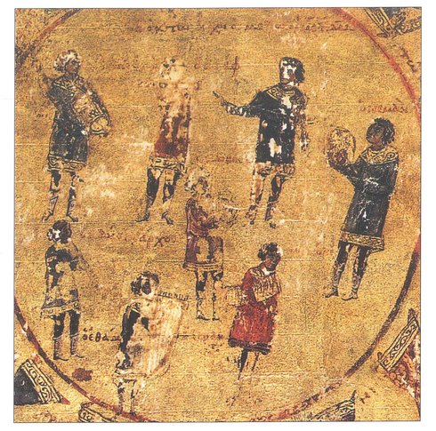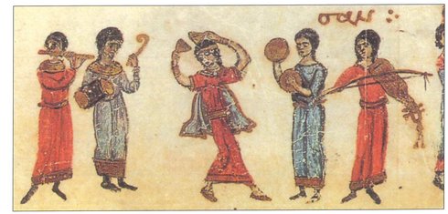 Im Manuskript Vatican Gr 752, einem byzantinischen Psalter, befinden sich rund 200 goldgehöhte Miniaturen. Dieses Manuskript, datierbar 1059 n. Chr., zeigt auf fol. 5 den König David umgeben von Musikern (Abb. 2). König David, der oft mit Musik in Verbindung gebracht wird, ist oben in der Mitte des Bildes dargestellt, zusammen mit einem Musiker, der seine lange Querflöte nach rechts hält. König David selbst spielt ein birnenförmiges Streichinstrument, und der Musiker rechts neben ihm hat Becken in den Händen. Die Gegenstände oder Instrumente in den Händen der übrigen sechs Figuren sind schwer zu identifizieren (s. Maliaras, S. 49).