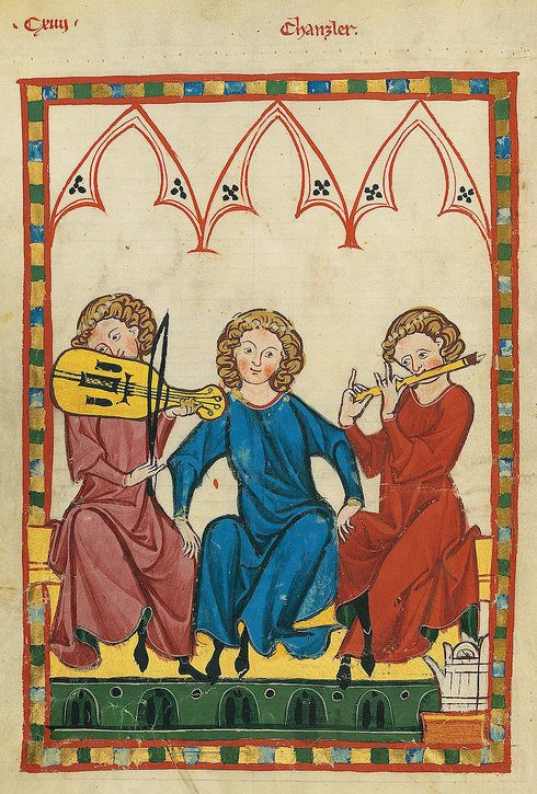 Ein weiteres Vorkommen der Flöte in weltlichem Zusammenhang findet sich im deutschen Sprachgebiet. Hier besteht das Ensemble aus einem Fidelspieler, einem Flötisten und einem Sänger, in einer Miniatur im Manesse-Kodex, zwischen 1304 und 1340 (Abb. 8). Der Kodex enthält, unter anderem, Lieder von Johannes Hardlaub (ca. 1300, verstorben 1340), dem mutmasslichen Redaktor der Handschrift.