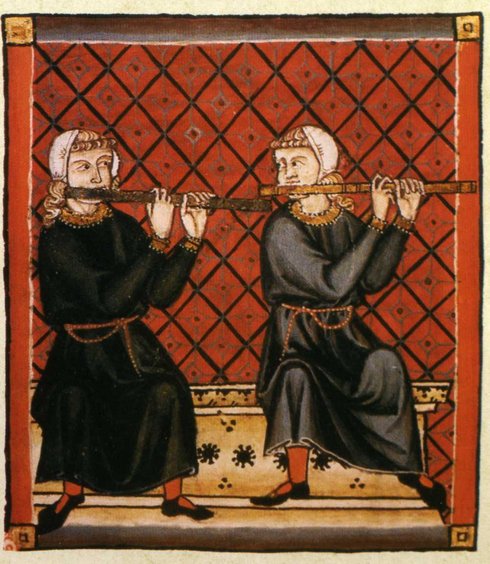 Das spanische einstimmige Repertoire der Cantigas de Santa Maria stammt vom Hof Alfons des Weisen (1221–1284), erhalten in mehreren Manuskripten vom Ende des 13. Jahrhunderts. Zusammen mit der musikalischen Notation enthalten sie reiche Illustrationen, die mehr als 40 Musikinstrumente abbilden, darunter die Querflöte: zwei Flötenspieler, die ihr Instrument nach links halten. Man ist der Ansicht, dass sie, während sie einander ansehen, wahrscheinlich ihre Instrumente stimmen (s. Abb. 7 und Powell, S. 19).