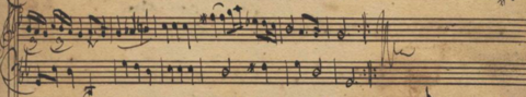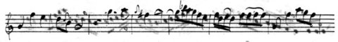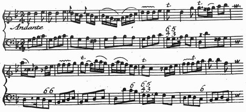 Abbildung 14 zeigt einen Fall der Verwendung des Tremolo in der Bassstimme in der Sonate GSM 1323b. Der 2. Satz dieser Sonate bietet mehrere interessante Vergleiche zwischen den Fassungen GSM 1323a (handschriftlich für Blockflöte) und b (gedruckt für Traverso). Im zweiten Takt der Fassung GSM 1323a gibt es eine halbe Note, gefolgt von einer Viertel (Abb. 20). In der chronologisch späteren Fassung GSM 1323b (Abb. 21) wird die lange Note durch ein Tremolo ersetzt.38 Interessanterweise geschieht in der Basstimme genau das Gegenteil (von einem Tremolo im zweiten Takt der Version GSM 1323a zu einer langen Note in GSM 1323b). Bemerkenswert sind auch die gleichzeitigen Tremoli im fünften und achten Takt der Version GSM 1323a.