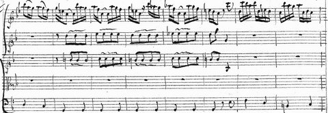 Die oben angeführten Beispiele zeigen, dass Sammartini das Tremolo in seinen Sonaten für Blasinstrumente sehr häufig notiert. Daher stellt sich die Frage, ob er es auch in seinen Kompositionen für andere Instrumente und in seinen Konzerten verwendet hat. Bemerkenswert ist das Tremolo in der Bassstimme der Sonate GSM 1323 (Abb. 14), deren zwei uns überlieferte Versionen in diesem Punkt identisch sind.