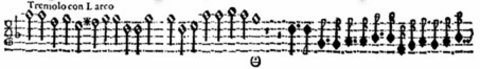 „Im 17. Jahrhundert sind die Geigenstimmen häufig mit einer als Tremolo bezeichneten Verzierung ausgeschmückt. Notiert wird es auf verschiedene Weise: Manchmal ist es kaum erkennbar, da allein der Name Tremolo als Spielanweiung notiert ist, manchmal wird es 'in allen Noten' notiert […] Mehrere Belege von englischen, französischen und deutschen Autoren liefern genaue Erklärungen und erkennen im Bogentremolo die Nachahmung eines Orgelregisters. […] Diese Beschreibungen laufen alle auf die gleiche Definition und einen gemeinsamen Ursprung hinaus: Das Bogentremolo ist eine Nachahmung des Orgeltremolo, eines mechanischen Registers, das nicht mit den Funktionsprinzipien der „voce umana“ oder des „fiffaro“ zu verwechseln ist, die in Italien Labialregister (und nicht wie in anderen Ländern Zungenregister) sind und auf der gleichzeitigen Wiedergabe zweier leicht unterschiedlicher Töne beruhen.“typo3/#_ftn113typo3/#_ftn1