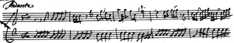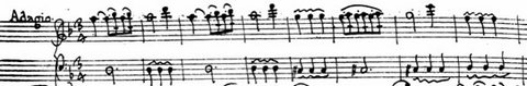 In den Oboenkonzerten des rothaarigen Priesters ist ein Beispiel bemerkenswert. Denn ein Vergleich zwischen dem Beginn des langsamen Satzes in den verschiedenen Versionen der Sonate GSM 1323 (siehe oben) und dem Beginn des langsamen Satzes im Oboenkonzert C-Dur RV 452 (Abb. 32) weist eine melodische Ähnlichkeit auf.43