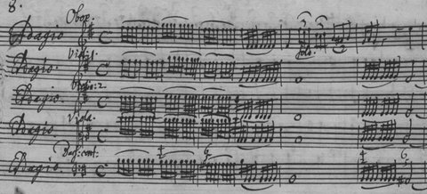 Es ist anzumerken, dass in den in Dresden erhalten gebliebenen Quellen Sammartinis, wie bei deutschen Orchesterstimmen üblich, kein explizites Beispiel für Tremolo (das durch eine Wellenlinie angezeigt wird) zu finden ist. Dabei ist seine Verwendung in den Streicherstimmen an einigen Stellen offensichtlich, wie im 2. Satz des Konzertes in D-Dur für Oboe GSM 1705a (Abb. 16), am Anfang des 1. Satzes des Oboenkonzertes in B-Dur (GSM 1708a) oder im 3. Satz der Sonate für Oboe und Streicher in B-Dur GSM 1706 (deren Kopist J. G. Pisendel ist, Abb. 17). In den Stockholmer Versionen der Konzerte in D GSM 1705b (der Violine zugeschrieben) und in Es GSM 1708b (ebenfalls für Violine und fälschlicherweise Giovanni Battista Sammartini zugeschrieben),37 sehen die fraglichen Passagen etwas anders aus. Während die repetierten Noten in Dresden verbunden sind, sind sie es in Schweden nicht (Abb. 18).