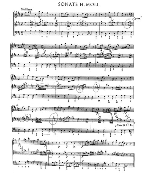 Ich habe sowohl das Ritornell der Erbarme-Dich-Arie als auch den Mittelsatz der h-Moll-Flötensonate in Synopse mit virtuellen unverzierten Stimmverläufen gebracht.