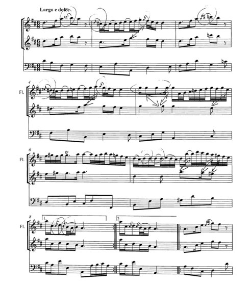 Im bereits genannten Largo aus Vivaldis Flötenkonzert 443 treffen wir – zusätzlich zum bereits angesprochenen Streicher-Accompagnato – auch in der Melodiebildung auf den bei Vivaldi seltenen Fall, dass er Ornamente ausnotiert, darunter Koloraturen, die rhythmisch gar nicht ausrechenbar sind (s. Bsp. 9).