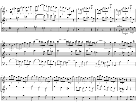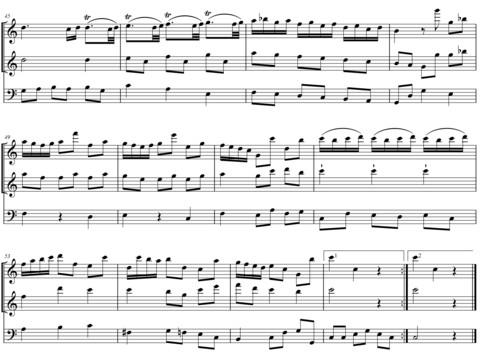 Die Oberstimme stellt also quasi das Triolen-Double eines zugrunde liegenden Menuetts dar, wobei weder das Thema noch mögliche umgebende Variationen wie bei Barsanti je erklingen. (Nimmt man das einfach zu ermittelnde Gerüst zum Ausgangspunkt, ließen sich solche jedoch unschwer selbst erstellen.)