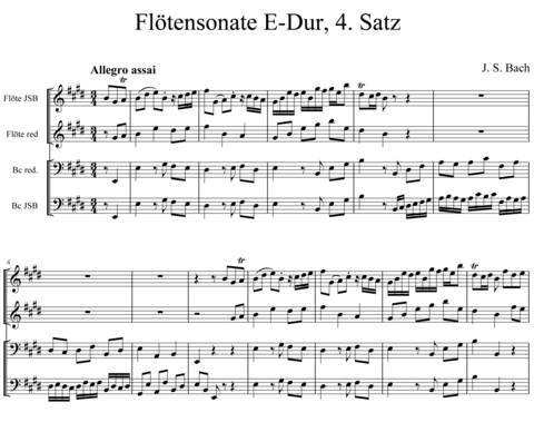 Da es im Folgenden noch ausführlicher um dasselbe Werk gehen wird, sei hier der erste Satz aus Bachs Flötensonate in E-Dur BWV 1035 angeführt in einer Synopse der überlieferten Partitur Bachs und hypothetischen ent-„manierierten“ Versionen von Melodie- und Bassstimme.