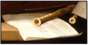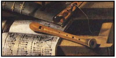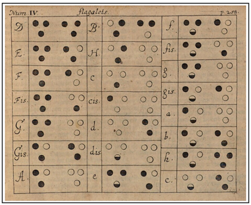 Es gibt ein weiteres wichtiges Detail in de la Hyres Gemälde. Unter dem größeren Flageolett ist eine sechslinige Tabulatur zu sehen. Dies ist eines der frühesten Zeugnisse dieser Art von musikalischer Notation für das Flageolett, auch bekannt als Punktnotation, mit vielen Beispielen in englischen Quellen. Möglicherweise ist diese Art der Notation zusammen mit dem Flageolett durch französische Musiker nach England gelangte, die sich Karl II. von England bei dessen Rückkehr aus Frankreich nach der Wiederherstellung der Monarchie im Jahr 1660 oder in den folgenden Jahren angeschlossen hatten.