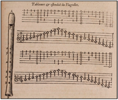 Der Unterschied zwischen Mersennes und Trichets Consort besteht darin, dass der Dessus des letzteren in c steht, einen Ton unter dem von Mersenne. Andererseits gibt Trichet nur eine Grifftabelle für die erste Oktave an und weist darauf hin, dass die zweite Oktave durch Überblasen der gleichen Griffe erreicht wird.32 Dies ist aber eine falsche Technik, da sich die Griffe für die zweite Oktave ändern33 und es notwendig ist, die Halblochtechnik für das obere Daumenloch anzuwenden.