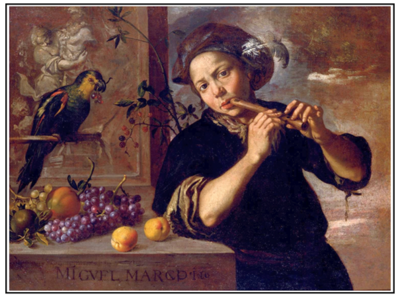 Neben den kleinen Flageoletts für Vögel waren im 17. Jahrhundert auch größere Instrumente in Spanien bekannt. Um ein solches könnte es sich bei dem vom Valencianer Miguel March (ca. 1633–1670) in seiner Alegoría del oído (Allegorie des Ohres) dargestellten Instrument handeln. Man sieht deutlich, wie die ersten beiden Finger der oberen Hand die oberen Löcher abdecken, während die beiden unteren (das erste ist offen) dem Zeige- und Mittelfinger der anderen Hand überlassen werden, die häufigste Fingerstellung, die auch schon 1636 von Marin Mersenne erwähnt wurde.