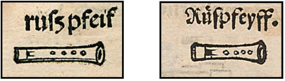 [21] Aulcungs vfent en lieu de fifre dudict flajol & fluttot nommé arigot, le quel selon sa petitesse à plus ou moings de trouz, les mieulx faits ont quatre trouz deuant & deux derriere, & est leur son fort esclattant, & pourroit on les appeller petites Tibies, par ce que premierement on les faisoit de Tibies, & iambes de Grues. (Thoinot Arbeau: Orchesographie, 1589, fol. 17).