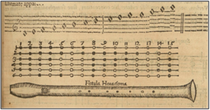 [23] Nicht der korrekte Fingersatz für das Flageolett, aber es ist schwer zu sagen, ob es dem richtigen Fingersatz entspricht, wenn man nicht sowohl das Original als auch die Kopie untersucht. Mahillon benutzte nicht den richtigen Fingersatz für die 6. (0 2) und 7. (0) Stufe der Tonleiter.