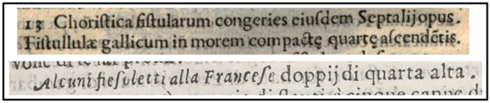 Im 17. Jahrhundert war das Flageolett auch in Italien bekannt. Neben der Erwähnung der Fiesoletti a la Francese (Fistullulae gallicum) im Katalog des Museums56 von Manfredo Settala (1600–1680), gibt es ein Kapitel über das Instrument im Compendio Musicale von Bartolomeo Bismantova (fl. 1677–1694)57, in dem er die Handhaltung beschreibt.