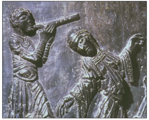 Kernspaltflöten mit bis zu vier oder mehr Löchern auf der Vorderseite sind in Europa seit prähistorischen Zeiten8 und insbesondere im Mittelalter bekannt. Vier Löcher und ein Daumenloch sind die maximale Anzahl von Löchern für ein Einhandinstrument. Instrumente wie das französische Flageolett (von nun an nur noch Flageolett) mit zwei Daumenlöchern + 4 Frontlöchern erfordern jedoch zwei Hände, um alle Löcher abzudecken.9 Eine frühe Darstellung einer mittelalterlichen Kernspaltflöte mit vier Löchern (der Schnabel ist deutlich sichtbar, während eine Markierung das Fenster sein könnte)10 findet man an der Christussäule (Bernwardsäule) des Hildesheimer Doms (Deutschland, ca. 1020). Hier begleitet der Spieler den Tanz der Salome.