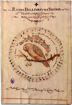 Im 17. Jahrhundert gab es das Instrument zwar in Spanien, es war aber nicht weit verbreitet. Eine der ersten spanischen Erwähnungen des Flageoletts bezieht sich auf seine Verwendung, um gefangene Vögel zum Singen zu bringen. In der Einleitung zu einem seiner Rätselkanons, Rueda dela Fortuna Ynfima (Das Rad des kleinen Glücks),58 beschreibt Juan del Vado (ca. 1625–1691), Organist der Real Capilla und Musiklehrer König Karl II. von Spanien (1661–1700), wie er mehrere Kanarienvögel gehört hatte, die mit einer kleinen Flöte trainiert worden waren: