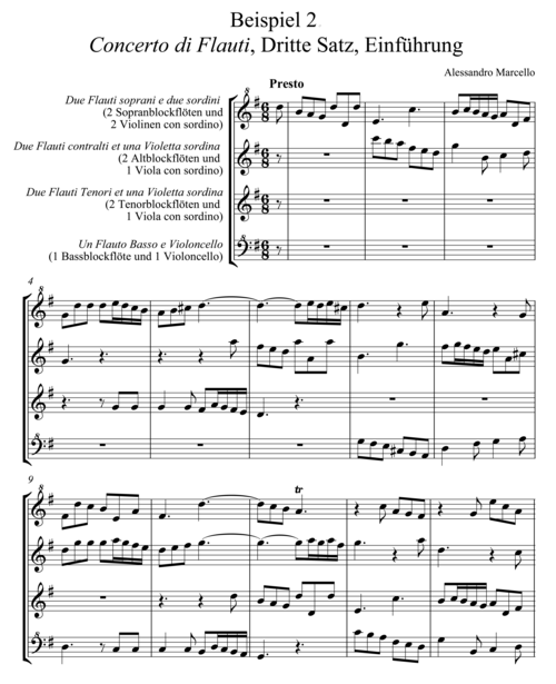 Ein bedeutendes überliefertes Stück für Instrumentalconsort ist das Concerto di flauti von Alessandro Marcello (2S 2A 2T B als Verdoppelung der Streicher). Es war wahrscheinlich für Amateure gedacht, die in der Accademia degli Animosi in Venedig spielen sollten, deren engagiertes Mitglied Marcello war. (NB 2)