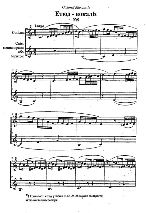 Der Schaffung eines eigenen Repertoires für die Sopilka widmete sich vollständig M. Kortschynskyj. Als Autor, Herausgeber, Arrangeur und Verleger prägte er intensiv die Entwicklung des Repertoires. Sein Ansatz zur Schaffung des Repertoires zeichnet sich durch das Bestreben aus, sowohl das Solo- als auch das Ensemble-Spiel umfassend abzudecken. Besonders hervorzuheben ist seine Entdeckung einer selten genutzten Ensemble-Kombination von Blasinstrumenten und Stimme. Ein ganz originelles Genre der Sopilka-Musik wird durch die Etüde-Vocalise und den Etüde-Kanon von M. Kortschynskyj repräsentiert, die in der Technik des zweistimmigen polyphonen Satzes geschrieben sind.7 Ungewöhnlich an diesen Werken ist die gleichwertige Rolle des Gesangs des Ausführenden, der den Kontrapunkt gleichzeitig mit dem Spiel führt und einen komplexen polyphonen Dialog schafft (Abb. 5).8