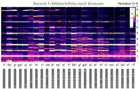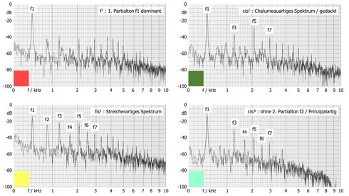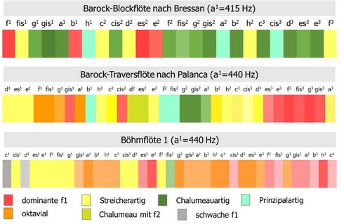 Ein Vergleich der Farbskalen für verschiedene Instrumente in Abbildung 6 visualisiert die Unterschiede in der Variabilität der Klangfarbe. Bei Blockflöten überwiegt der Chalumeauartige Charakter. Die oktavialen Töne sind bei den Querflöten deutlich. Wenn der Charakter der Klangfarbe im Vergleich zu Abbildung 4 und 5 weniger deutlich erscheint, wurde die Farbe entsprechend aufgehellt.