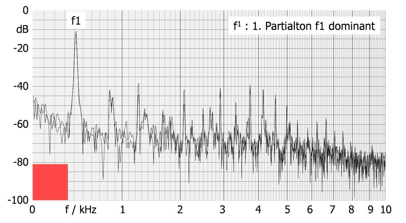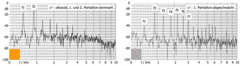 Tiefe Töne der Böhmflöte weisen oft ein breites Spektrum an Partialtönen auf. Bei einzelnen Tönen gelingt es, den Grundton abzuschwächen, was die Expressivität der Klangfarbe erhöht (Abbildung 5 rechts).