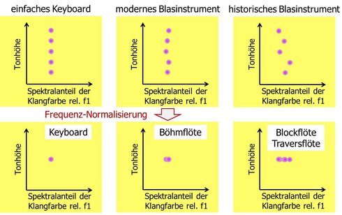 Die Trennung der spektral bedingten Klangfarbe von der Tonhöhe führt zu einem Klangfarbenprofil, das schnelle Vergleiche zwischen verschiedenen Instrumenten zulässt, und so auch die Anschauung der instrumentenspezifischen Variabilität stützt. Auf diese Weise kann auch der Einfluss des Kammertons (z. B. 415, 440, 466 Hz) und des Stimmungssystems eliminiert werden. Eine präzise Transformation der Tonhöhe auf den gewählten Normwert ist nur durch Dehnung oder Stauchung im Zeitbereich mit ausreichender Qualität möglich. Daher muss sich die Transformation auf den eingeschwungenen Zustand (steady-state) beziehen; Das Verhalten des Instruments bei attack und decay ist auszuklammern. Die Originalsignale dürfen keine zeitlichen Varianzen wie Vibrato, Crescendo/Decrescendo etc. aufweisen. Es hat sich bewährt, auch die Lautheit zu normalisieren.