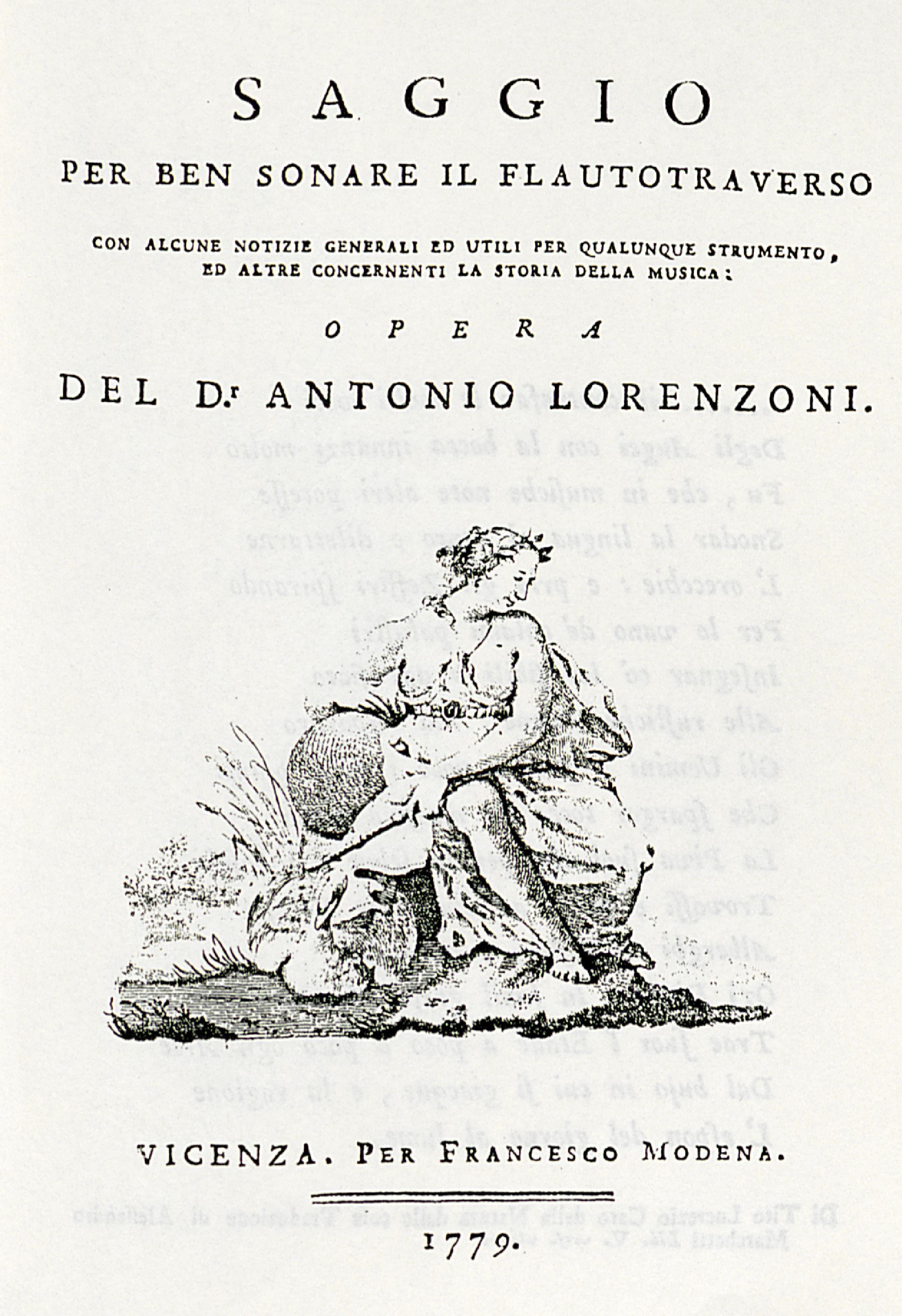 Im Jahre 1779 druckt der kleine Verlag von Francesco Modena in Vicenza ein neunzigseitiges Büchlein, sein erstes zum Thema Musik,1 mit dem Titel Saggio per ben sonare il Flautotraverso con alcune notizie generali ed utili per qualunque(...)