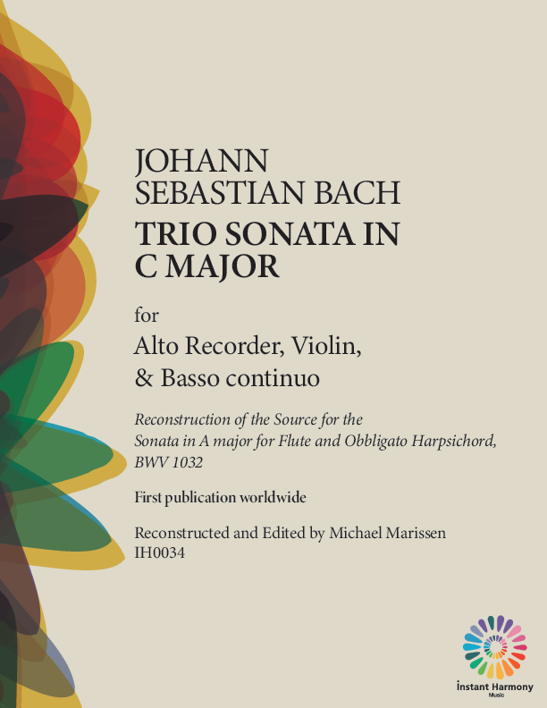 for Alto Recorder, Violin & Basso continuo, reconstruction of the source for the Sonata in A major for Flute and Obbligato Harpsichord, BWV 1032, first publication worldwide, reconstructed and edited by Michael Marissen, BRA-São(...)