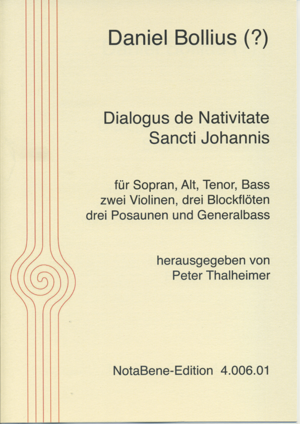 Daniel Bollius (?): Dialogus de Nativitate Sancti Johannis für Sopran, Alt, Tenor, Bass, zwei Violinen, drei Blockflöten, drei Posaunen und Generalbass (Hg. Peter Thalheimer), Schwäbisch Hall 2025, NotaBene-Edition,(...)